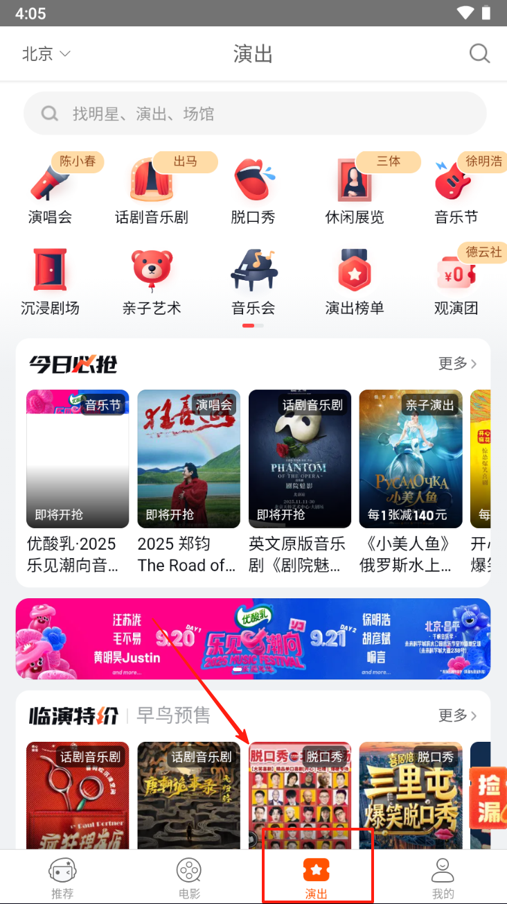4、查找演出信息:在演出分類下,瀏覽即將開搶的演出和特價(jià)預(yù)售信息。
