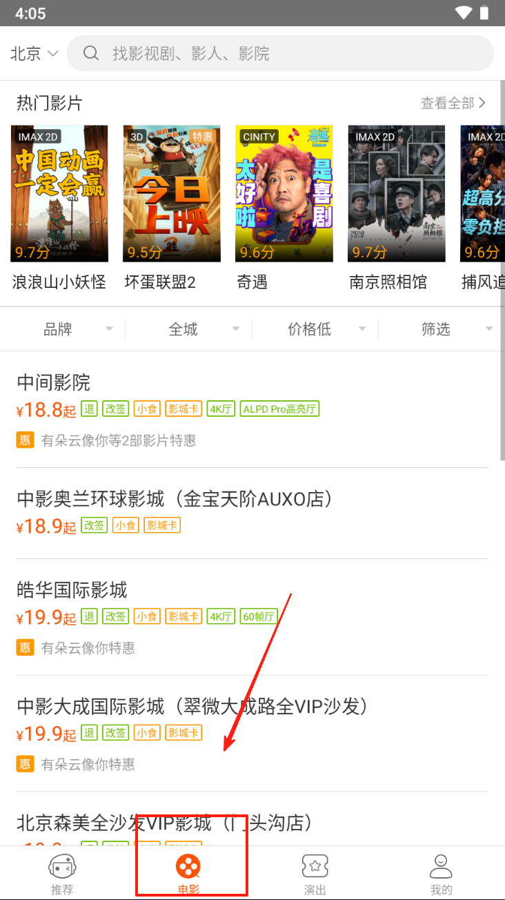 2、進(jìn)入推薦頁面:在推薦頁面中,選擇“電影”或“演出”分類查看熱門內(nèi)容。