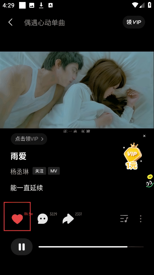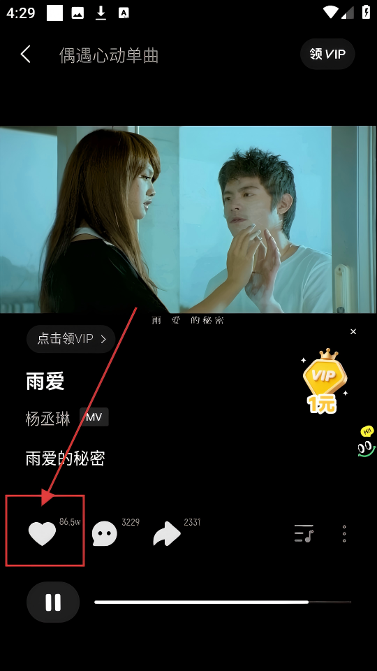 3、點擊心形圖標后,圖標變成紅色,說明收藏成功,這樣就能輕松找到喜歡的歌曲啦。