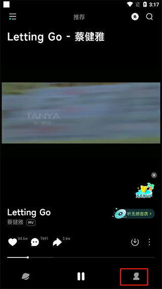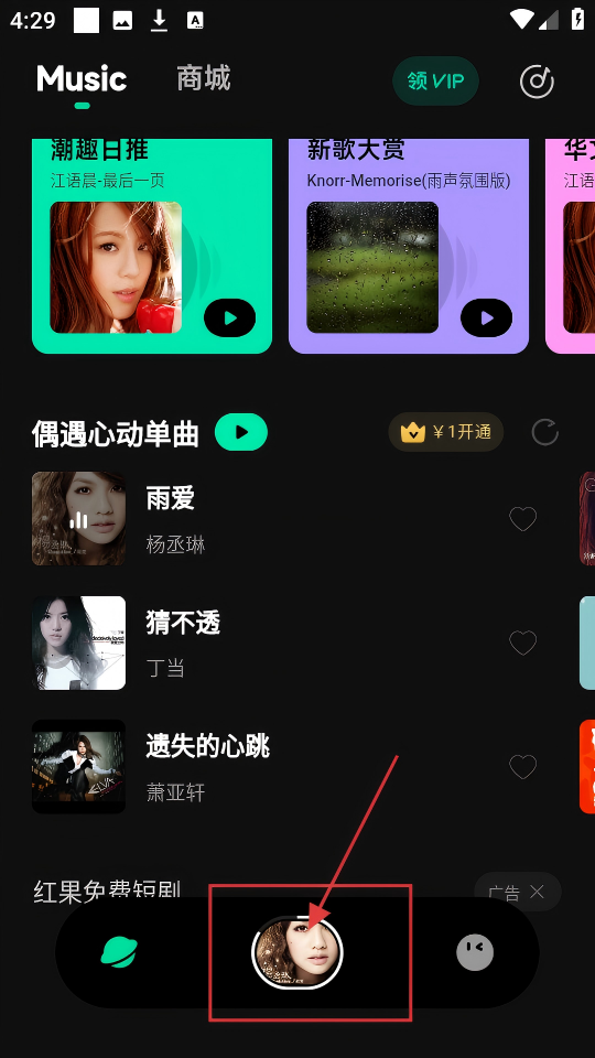 1、在音樂主頁面,看到底部播放欄里的歌曲,點擊它就能進入播放頁面,快去操作吧。