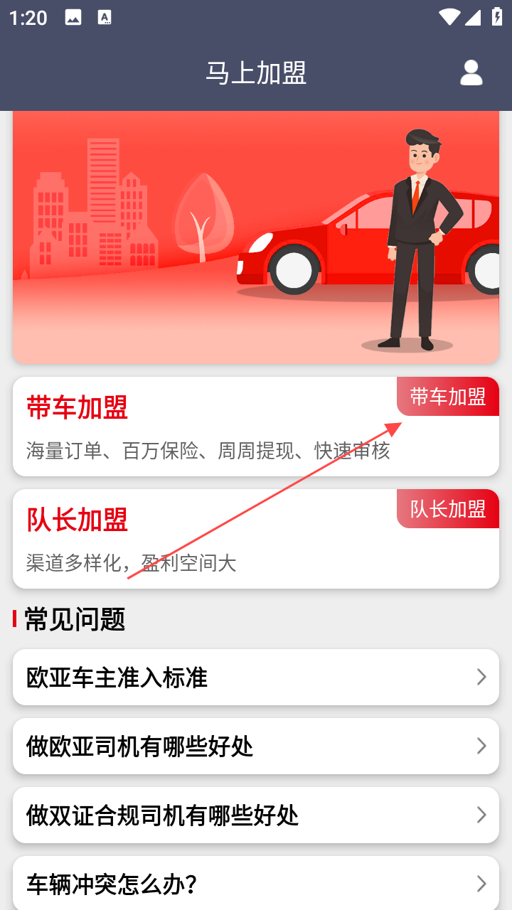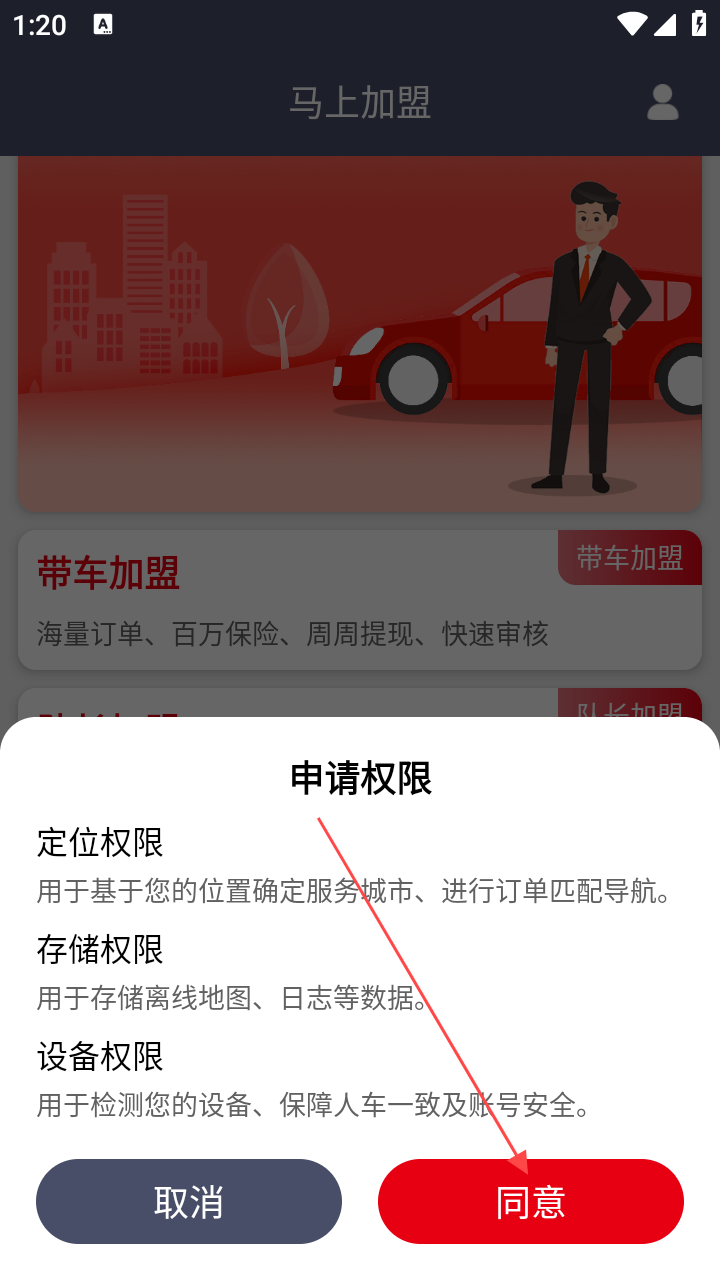 1、打開應用登錄后,進入到馬上加盟頁,選【帶車加盟】,在權限申請彈窗點【同意】。