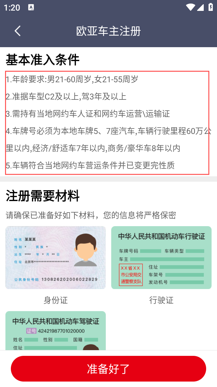 3、查看“歐亞車主注冊”基本準入條件,確認是否符合要求,準備好身份證、行駛證、駕駛證等材料,點擊【準備好了】。