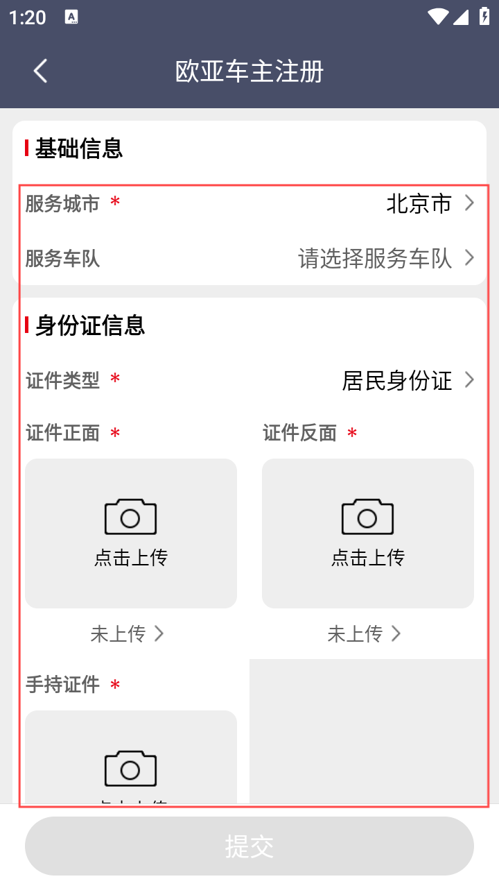 4、進入注冊界面,填寫服務城市、服務車隊,上傳身份證正/反面、手持證件照,點【提交】完成注冊。