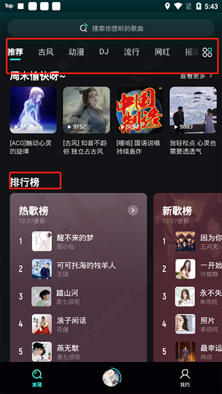 2、在“發(fā)現(xiàn)”頻道內(nèi)設(shè)歌曲排行榜以及歌曲分類;